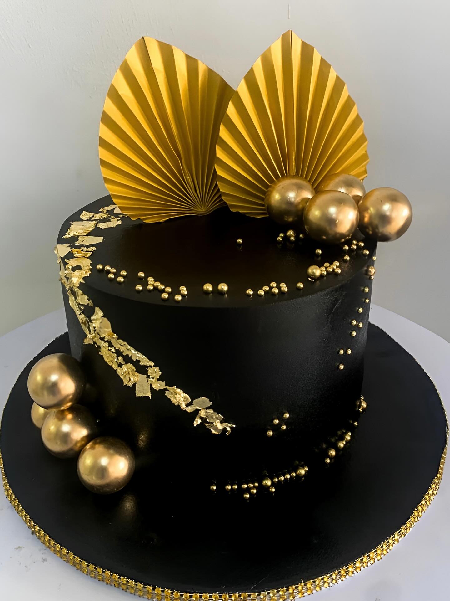 Sophisticated black cake adorned with gold fans, beads, and leaf accents. Perfect for luxury birthdays, milestone events, and elegant celebrations.