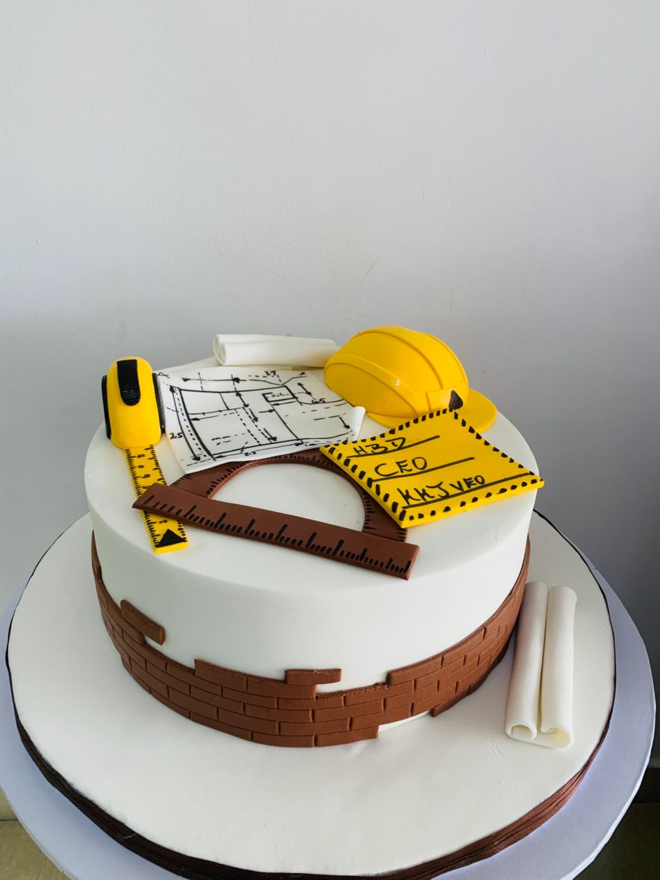 A creative cake design featuring edible construction elements like a yellow hard hat, measuring tape, blueprints, and drafting tools. Perfect for celebrating builders, engineers, or anyone who loves construction.