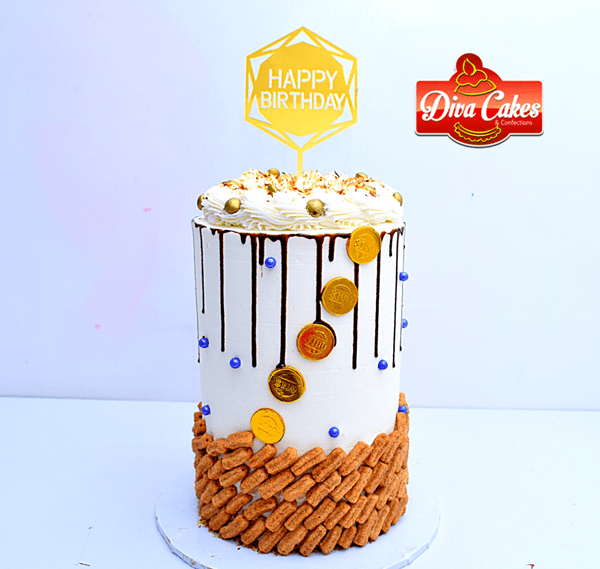 White and brown cake with chocolate drips, gold coins, and cookie-textured detailing. Perfect for stylish birthdays, dessert lovers, and modern celebrations.