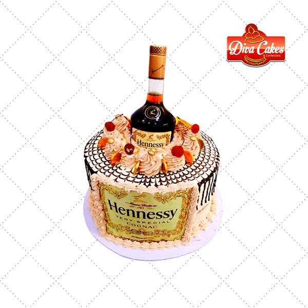 A bold cake design featuring cream swirls, cherries, chocolate drizzle, and a realistic Hennessy bottle topper. Perfect for milestone birthdays and grown-up celebrations.