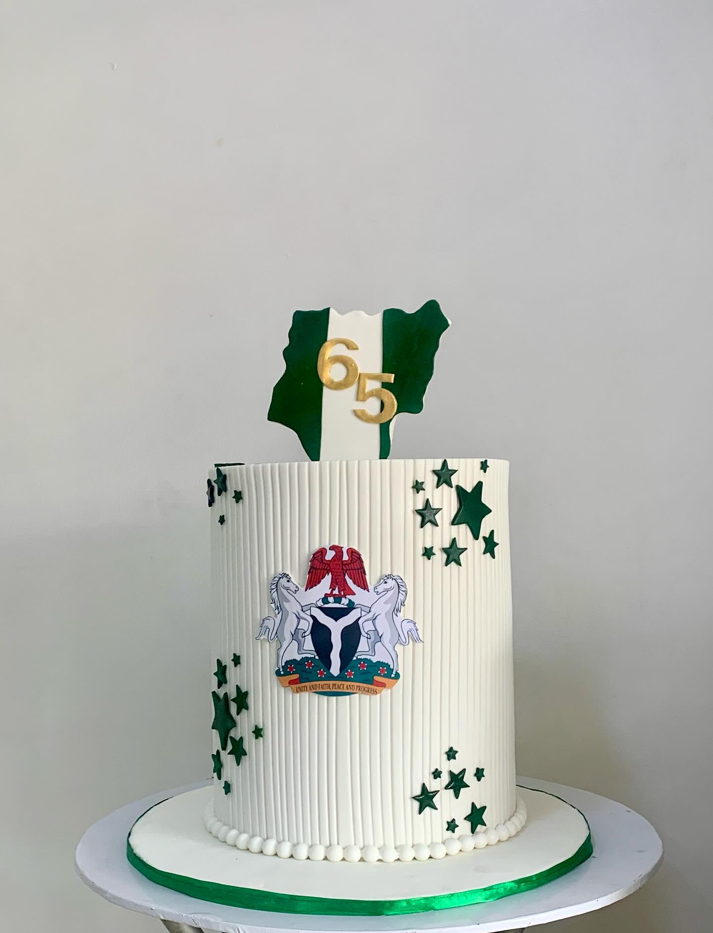 White cake with green stars, Nigerian coat of arms, and a map design celebrating 65 years of independence. Ideal for patriotic events, national celebrations, and themed parties.