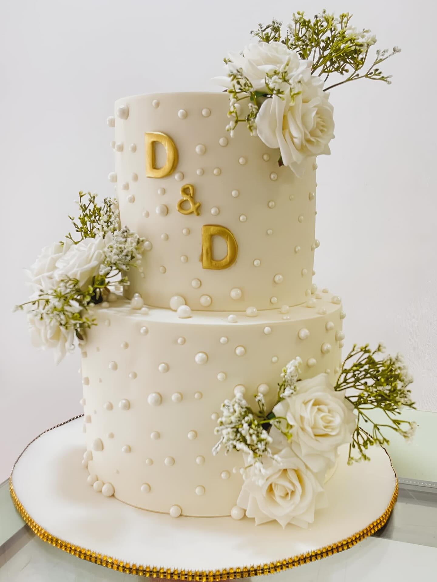Classic white cake with pearl accents, fresh florals, and custom gold initials. Perfect for weddings, anniversaries, and sophisticated couple celebrations.