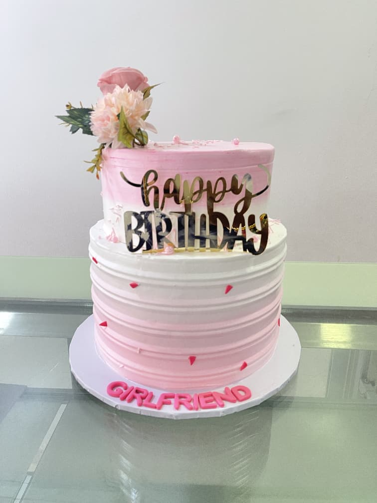 A sweet two-tier cake with pink and white layers, heart accents, floral toppers, and a bold “happy BIRTHDAY” sign. Perfect for celebrating your girlfriend in style.