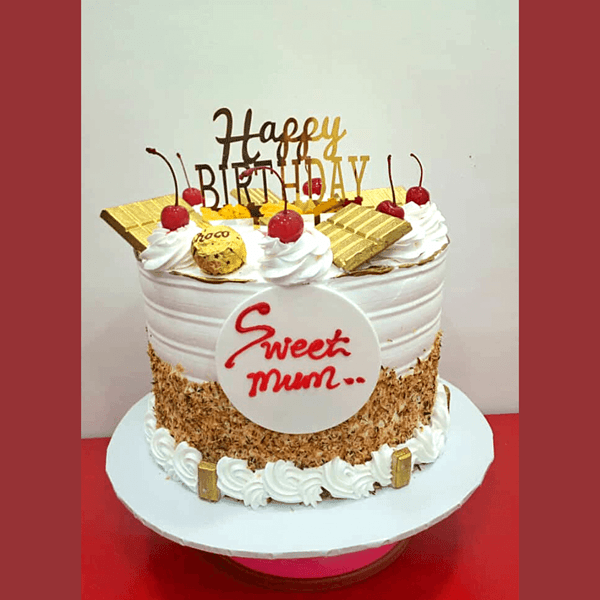White cake with coconut flakes, cherry toppers, chocolate bars, and Ferrero Rocher. Perfect for celebrating mums on birthdays and special family occasions.