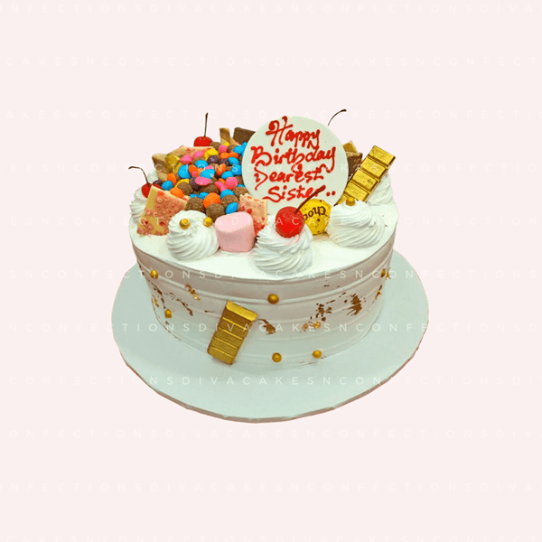 White cake with gold accents topped with chocolates, marshmallows, cherries, and colourful candy. Perfect for celebrating sisters on birthdays and joyful family occasions.